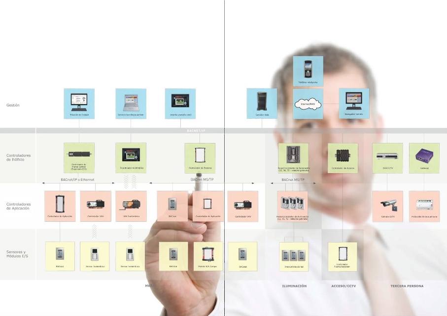 Con este sistema de buses se garantiza la máxima velocidad de comunicación, su principal característica es el reconocimiento online de todos los equipos que se encuentran conectados a esta red, así si se conectan equipos de cualquier otra marca que comuniquen en BACnet, se pueden inmediatamente colocar en nuestro sistema e interaccionar con el para generar aplicaciones nuevas.